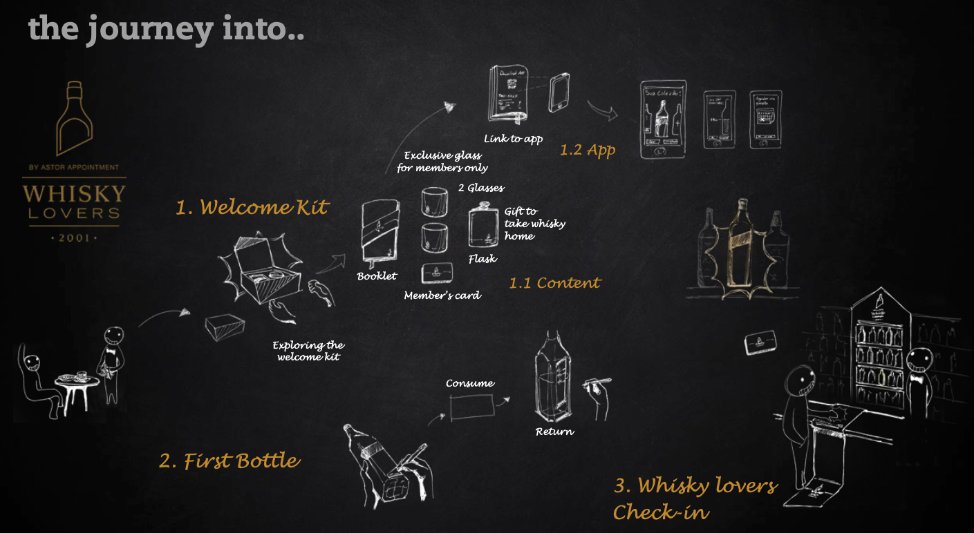 The work began with design research including shadowing, interviews, safaris, and observation, informing the mapping of different consumption journeys and revealing opportunities to rethink how whisky is discovered and shared.